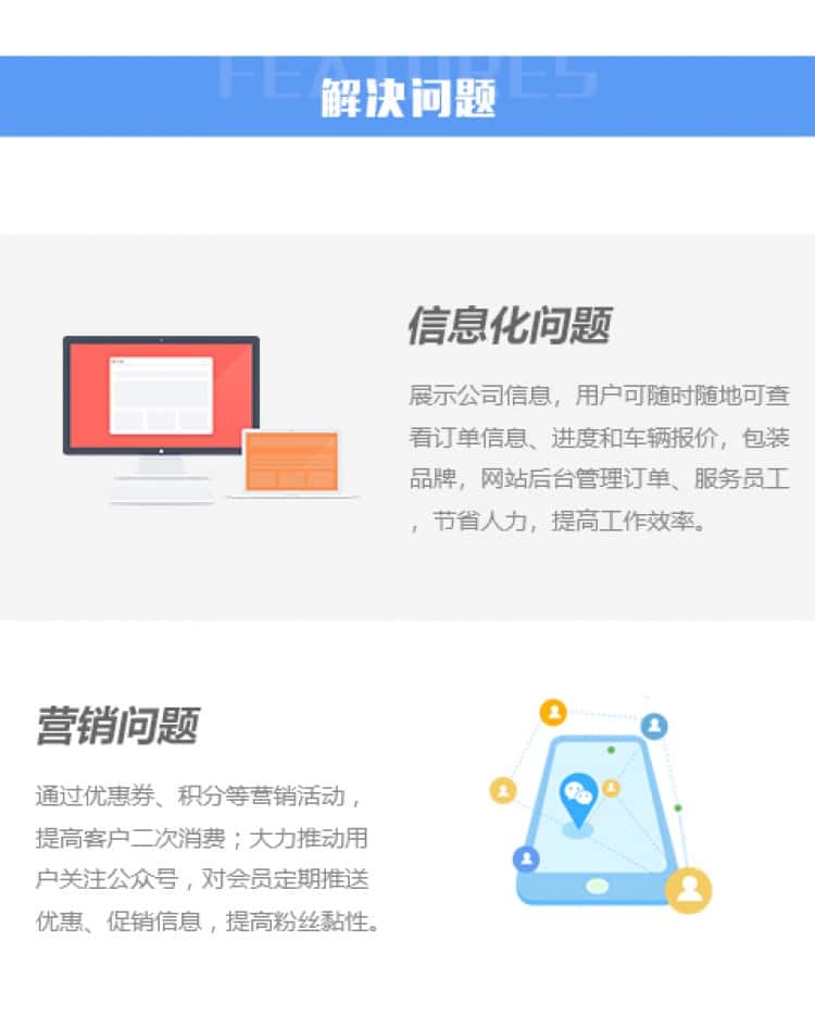展示公司信息,用户可随时随地可查看订单信息、进度和车辆报价,包装品牌,网站后台管理订单、服务员工节省人力,提高工作效率